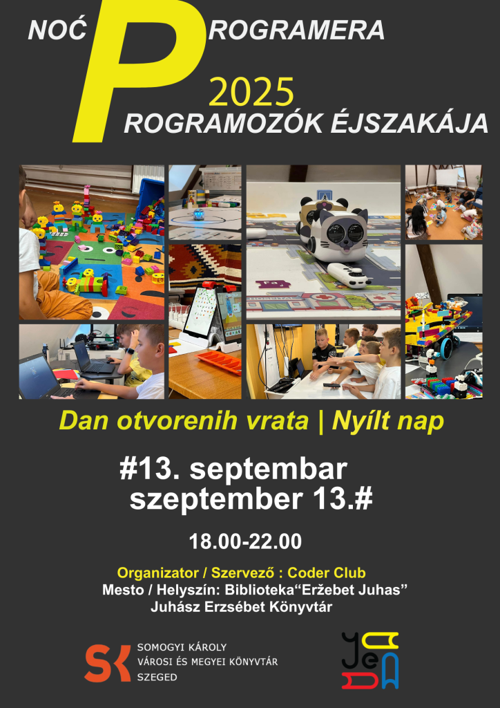 Tisztelettel és szeretettel meghívjuk a topolyai Juhász Erzsébet Könyvtár keretében működő Coder Club nyílt napjára, a Programozók éjszakájára, amelyet szeptember 13-án, a programozók napján* tartunk 18 és 22 óra között a könyvtár Coder termében, a Topolyai Napok rendezvényeként.