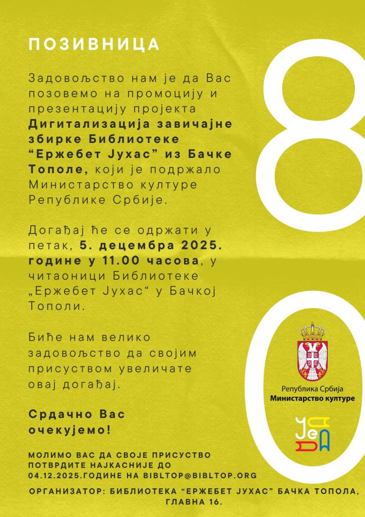 У петак, 5. децембра 2025. године, у 11 часова у читаоници Библиотеке „Ержебет Јухас“ бити одржана промоција и презентација пројекта „Дигитализација завичајне збирке библиотеке Ержебет Јухас из Бачке Тополе“, који је реализован уз подршку Министарства културе Републике Србије.